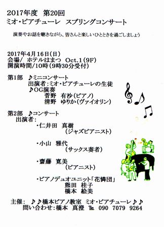 毎年恒例のスプリングコンサートは、2017年度の今回(4月16日開催)で、20回目となる節目を迎えました。これも生徒さん、ご父兄の皆様方のお陰と本当に感謝申し上げます。 第1回目の生徒さんはすっかり成長され、それぞれの道に進まれ皆さん頑張って見えます。大変嬉しく思います。
